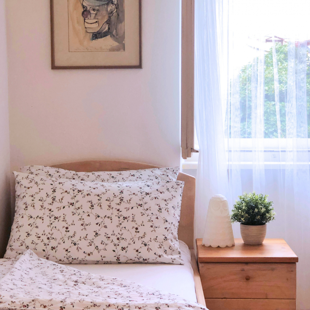 Im zweiten Stock befinden sich zwei komfortable Schlafzimmer: eines mit einem großen Doppelbett und ein weiteres mit zwei Einzelbetten. Von hier aus gelangen Sie durch ein Dachfenster auf eine kleine Terrasse, die einen herrlichen Blick auf die Stadt und das Meer bietet – sowohl in Richtung Golf von Triest als auch zur Bucht von Portorož.