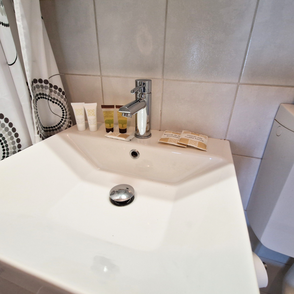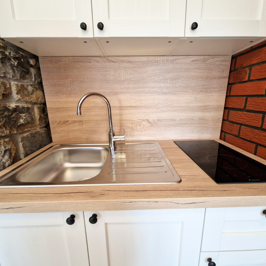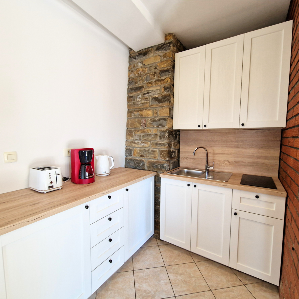 Beim Betreten erwartet Sie ein großzügiger Wohnbereich mit einem TV und einem großen Esstisch für gesellige Abende. Die gemütliche Sofa lässt sich bei Bedarf in ein Bett für einen weiteren Gast verwandeln. Auf der rechten Seite befindet sich eine praktische Küchenzeile, ausgestattet mit Toaster, Filterkaffeemaschine, Wasserkocher und Mikrowelle. Der Schlafbereich ist geschickt in eine halboffene Nische integriert, was dem Apartment eine helle und luftige Atmosphäre verleiht. Gleich rechts neben dem Eingang liegt das Badezimmer mit einer Dusche.