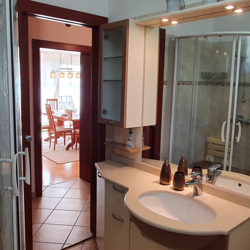 Spacious and above-standard furnished holiday apartment with one of the most beautiful views of the sea that Portorož has to offer. Aria Wellness apartment is located in Beli Križ above Portorož and provides truly perfect comfort. The large kitchen will not let you down in even the most demanding kitchen endeavours, as it is equipped with all modern appliances. The kitchen continues into a spacious and sunny dining room and a comfortable living room with a fireplace and smart TV. Resting on the balcony with a view of the blue sea offers you a complete break from everyday life and relaxation, but you can also opt for some activities with the sports equipment available here. The apartment has a separate bedroom with a double bed with the possibility of using the sofa bed for two people in the living room. The entire apartment is air-conditioned, heated, safe and secure and offers wireless internet access. Next to the building, there is a covered car park. Upon arrival, each guest is also greeted with a welcome basket and small gifts.