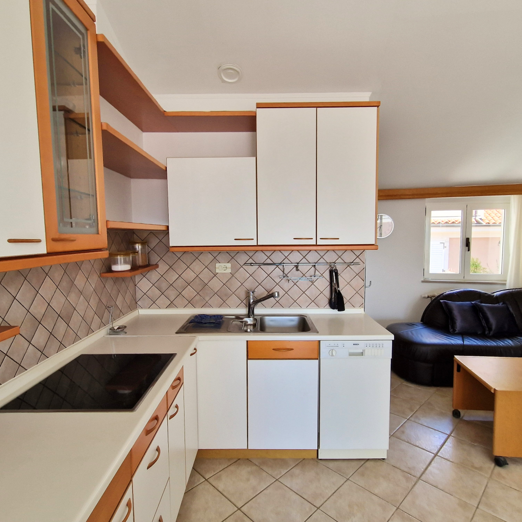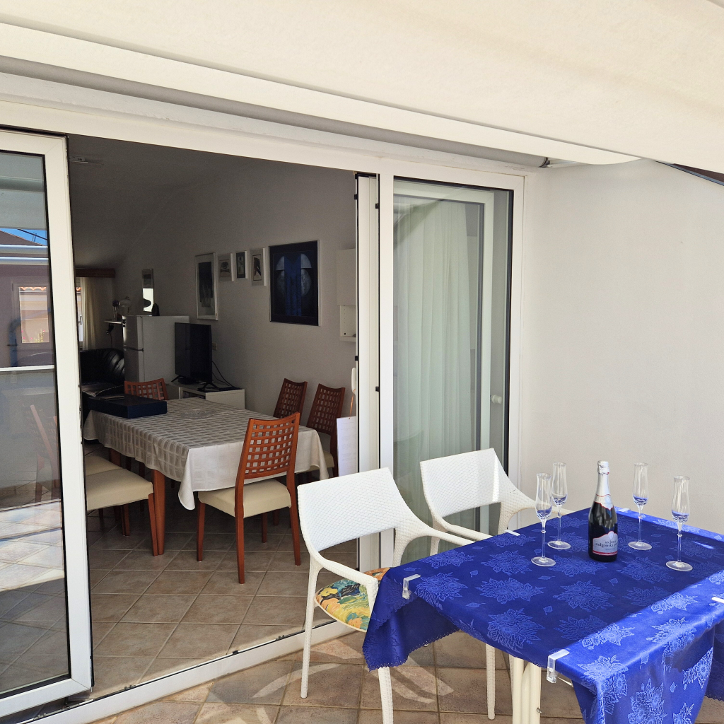 Step outside onto the beautiful large terrace, where you can enjoy stunning sea views. The terrace is furnished with an outdoor table and two sun loungers, perfect for soaking up the sun or dining al fresco.