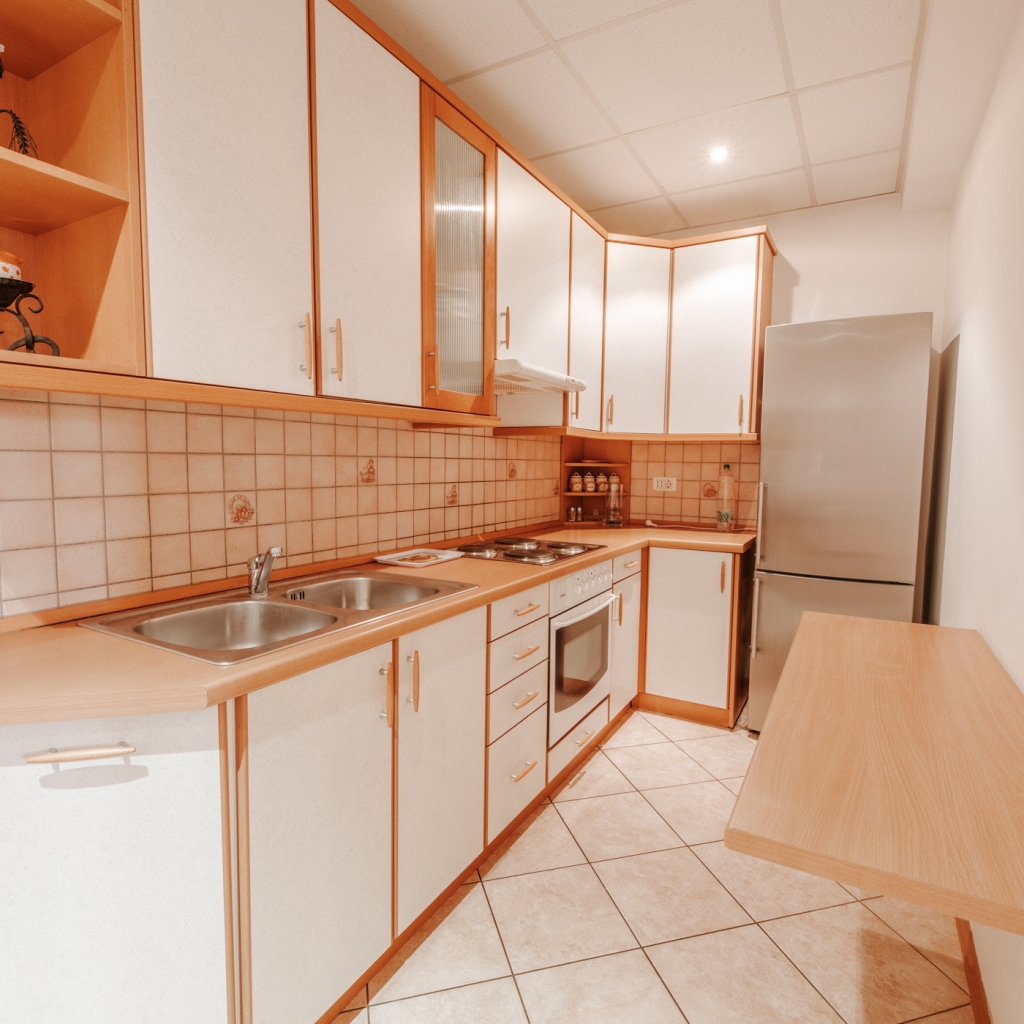 Apartma ima dve spalnici: v prvi spalnici je zakonsko ležišče in enojna postelja, v drugi pa enojno izvlečno ležišče, ki se lahko spremeni v ležišče za dve osebi. Prostorna kuhinja je opremljena z vsemi potrebnimi aparati za pripravo obrokov in vključuje jedilni kot z veliko mizo za pet oseb. Kopalnica ima tuš in pralni stroj. Gostom so na voljo tudi klimatska naprava, brezžični internet (Wi-Fi), posteljnina in brisače.