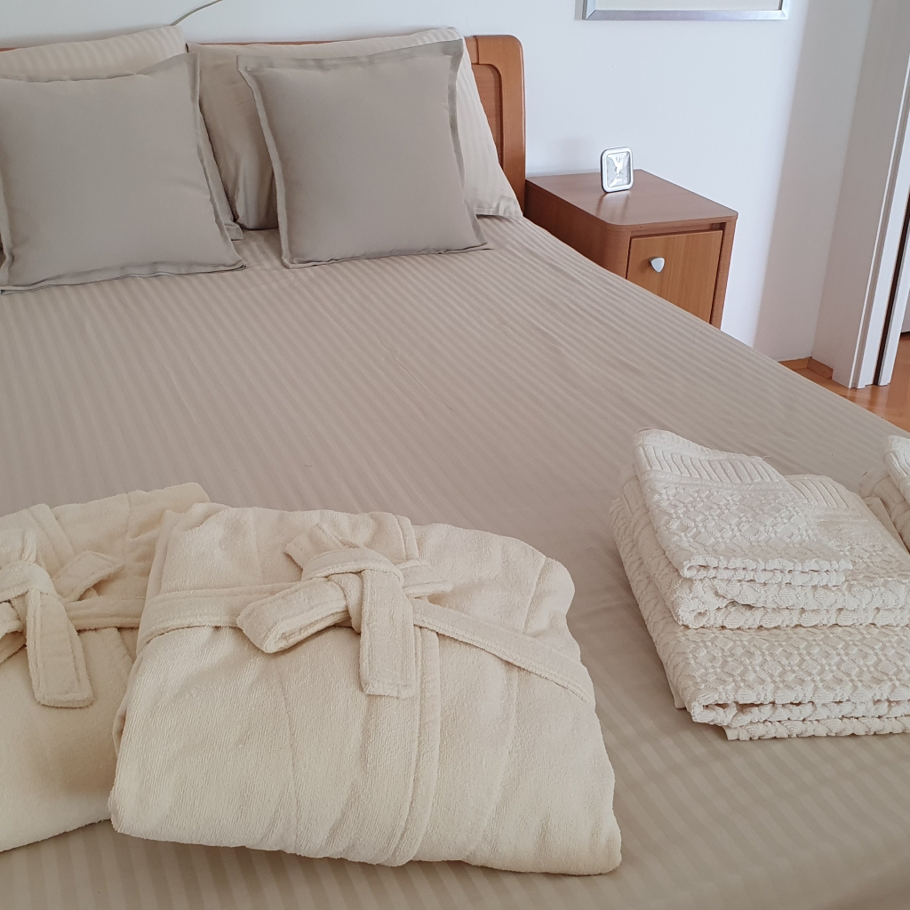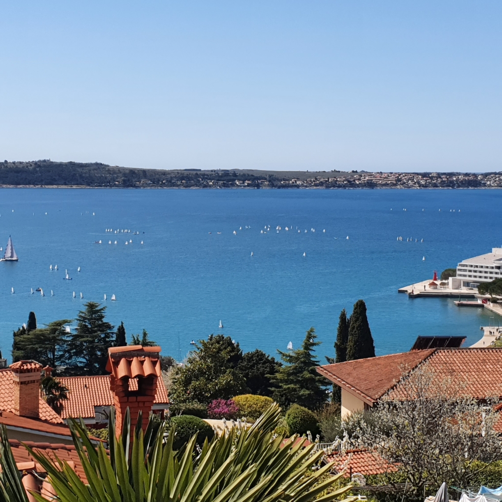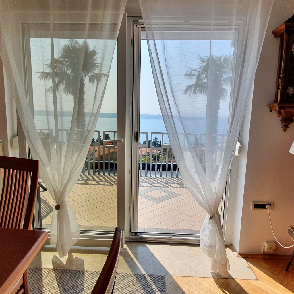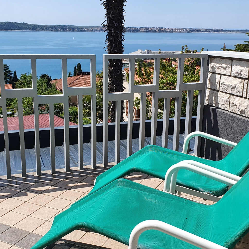 Spacious and above-standard furnished holiday apartment with one of the most beautiful views of the sea that Portorož has to offer. Aria Wellness apartment is located in Beli Križ above Portorož and provides truly perfect comfort. The large kitchen will not let you down in even the most demanding kitchen endeavours, as it is equipped with all modern appliances. The kitchen continues into a spacious and sunny dining room and a comfortable living room with a fireplace and smart TV. Resting on the balcony with a view of the blue sea offers you a complete break from everyday life and relaxation, but you can also opt for some activities with the sports equipment available here. The apartment has a separate bedroom with a double bed with the possibility of using the sofa bed for two people in the living room. The entire apartment is air-conditioned, heated, safe and secure and offers wireless internet access. Next to the building, there is a covered car park. Upon arrival, each guest is also greeted with a welcome basket and small gifts.