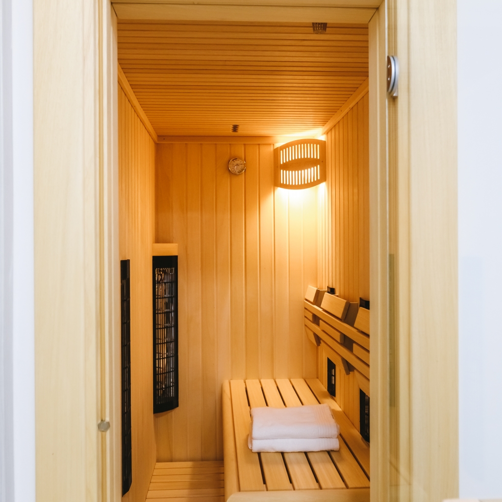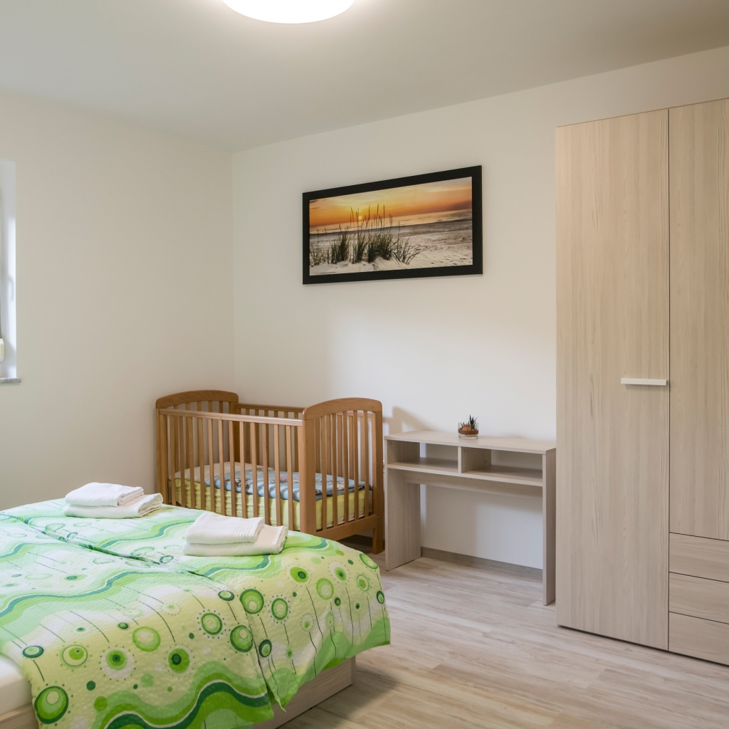 In front of the apartment, there is a terrace with a large heated swimming pool with night lighting, which is intended only for guests of the apartment. On the fenced terrace, hidden from view, you can relax sunbathing or enjoying the comfort of deckchairs, a swing, and other outdoor equipment. If you prefer a more active holiday, there is also exercise equipment available to complete your daily exercise routine.