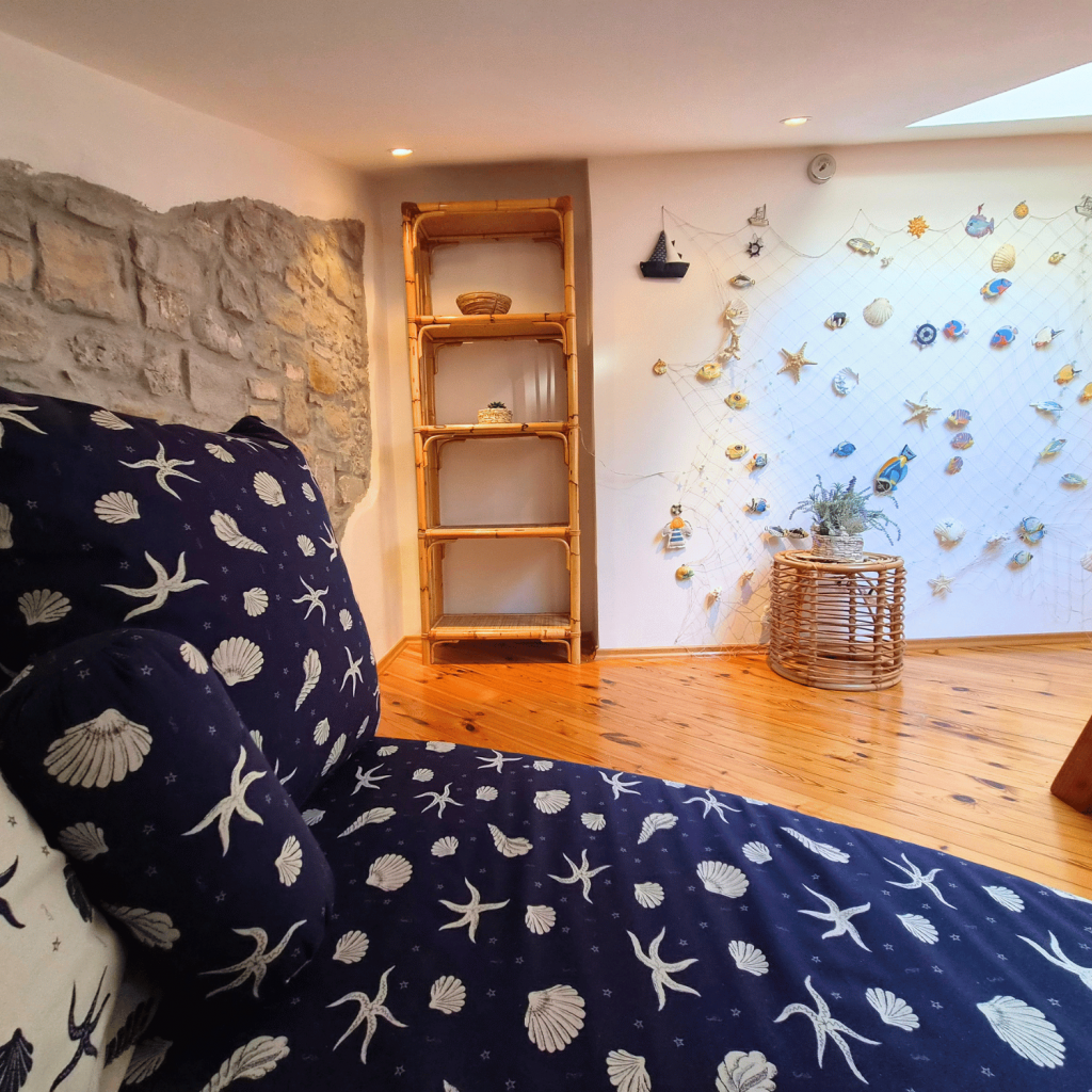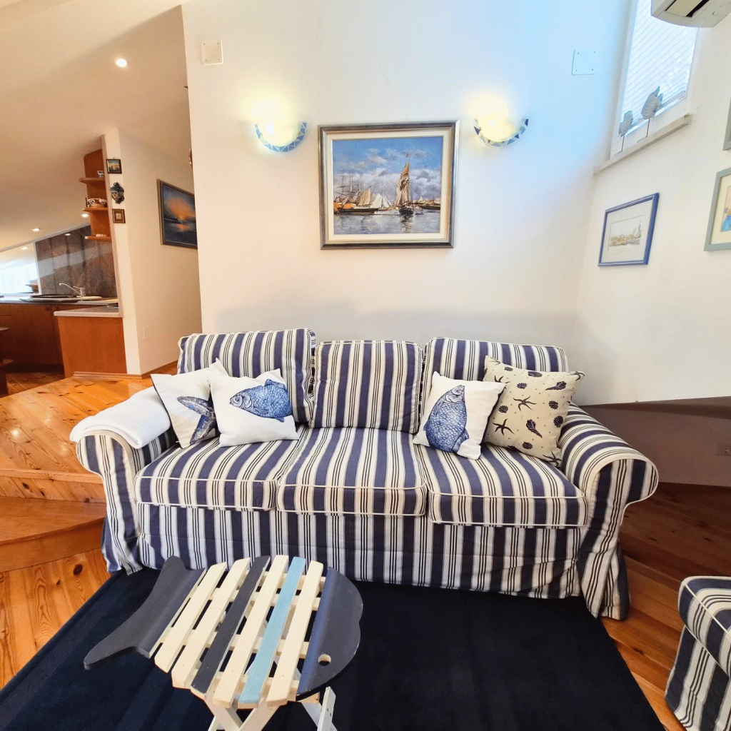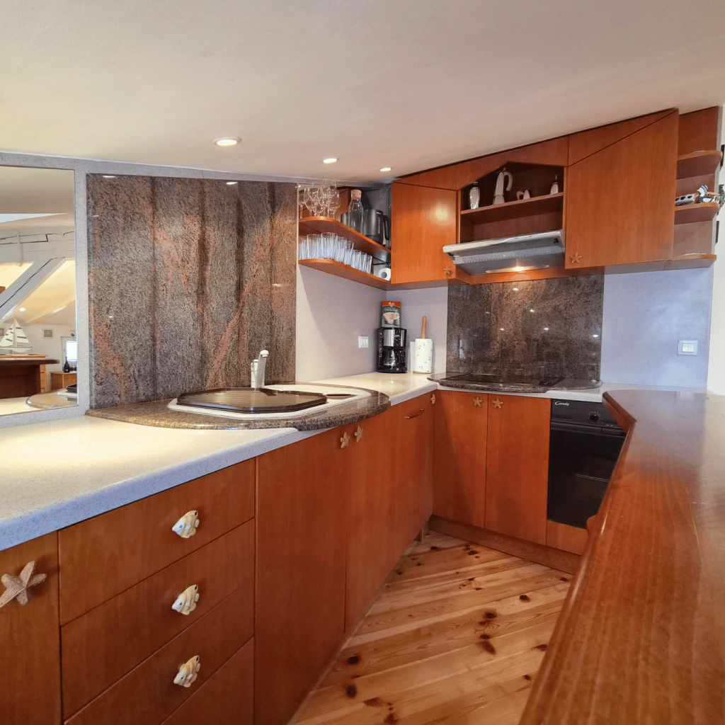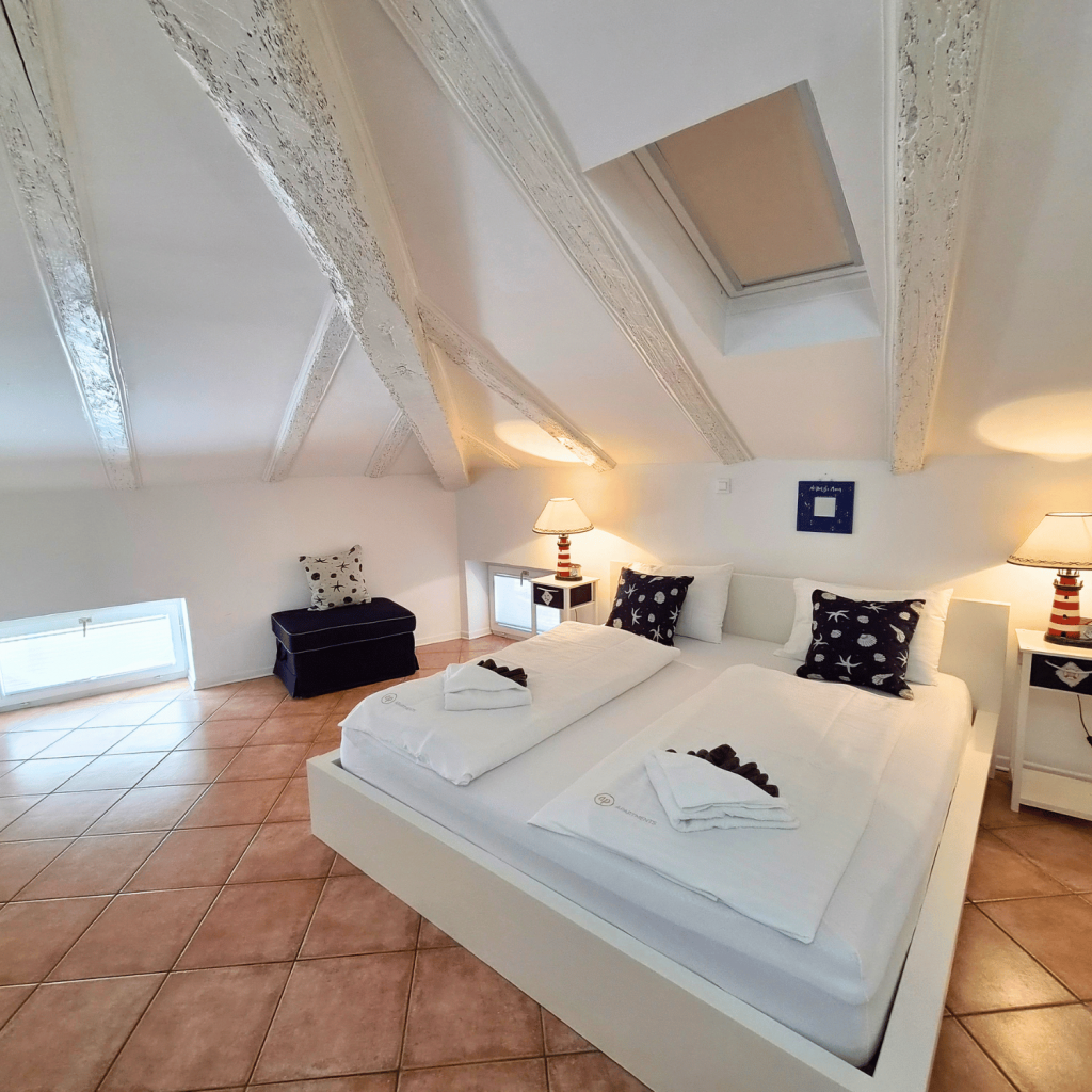 Stanovanje velikosti 82 m² navdušuje s svetlobo, toplino in skrbno izbranimi detajli. Leseni tramovi in mediteranski pridih ustvarjajo prijeten ambient za sproščen oddih v dvoje, z družino ali prijatelji. Na voljo sta udobna spalnica z veliko zakonsko posteljo in prostorno garderobno omaro ter dnevni prostor z raztegljivim kavčem za še dve osebi. Kuhinja je popolnoma opremljena za pripravo obrokov, kopalnica pa vključuje tudi pralni stroj.