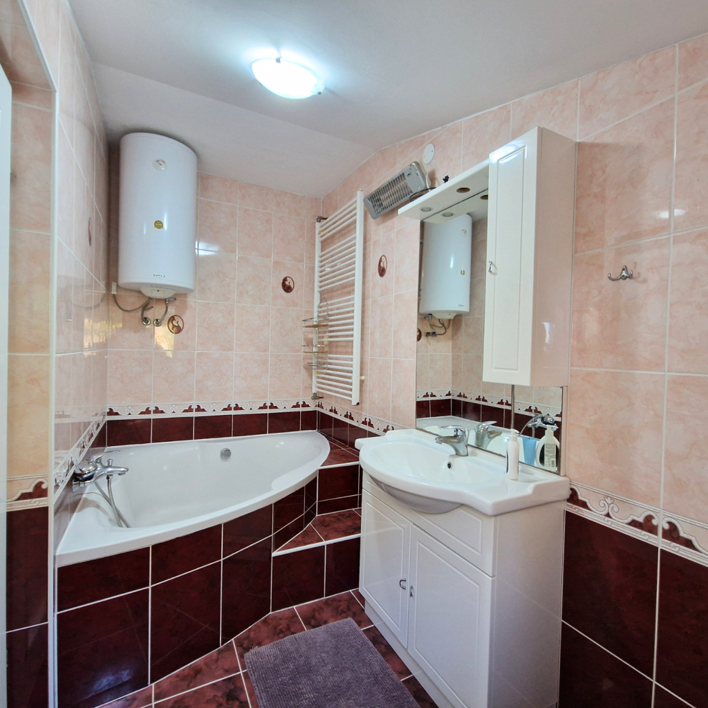 Na voljo so še popolnoma opremljena kuhinja, dodatna kopalnica s tušem in pralnim strojem, prostorna dnevna soba s kavčem in velikim TV-jem ter ločena jedilnica za šest oseb. Celoten apartma je v pritličju, klimatiziran z dvema klimatskima napravama in dodatnim ventilatorjem v jedilnici. Hitri WiFi, posteljnina in brisače so vključeni.