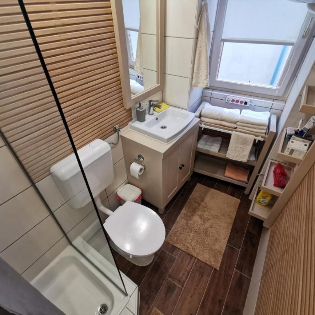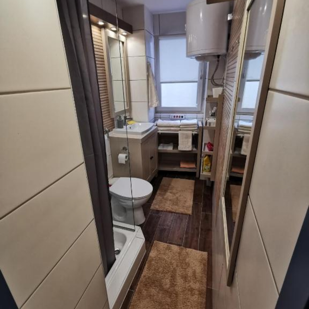 Studio se nahaja na drugem nadstropju večstanovanjske stavbe. Ima komfortno bivalno sobo z zakonskim ležiščem, kavčem, veliko omaro, predalnikom ter jedilno mizo, ki služi tudi kot kuhinjski pult.  Kuhinja se nahaja v tem istem prostoru in je opremljena s kuhalno ploščo, napo,  hladilnikom, pomivalnim koritom, ter kuhinjsko opremo in jedilnim priborom.  V kopalnici je WC, tuš kabina ter umivalnik. Vsi prostori so ogrevani in klimatizirani.
